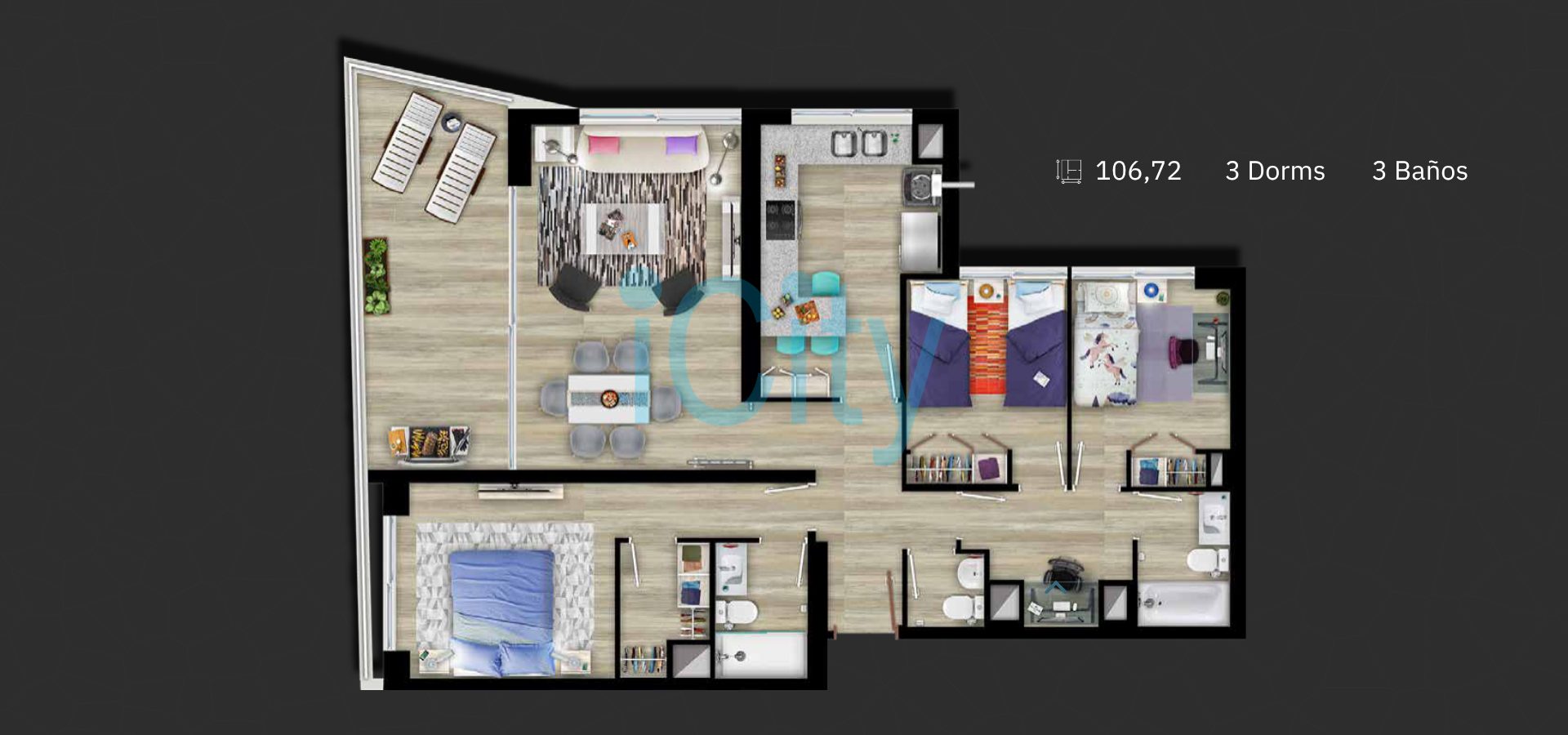 Distribución: 3 Dormitorios y 3 Baños.